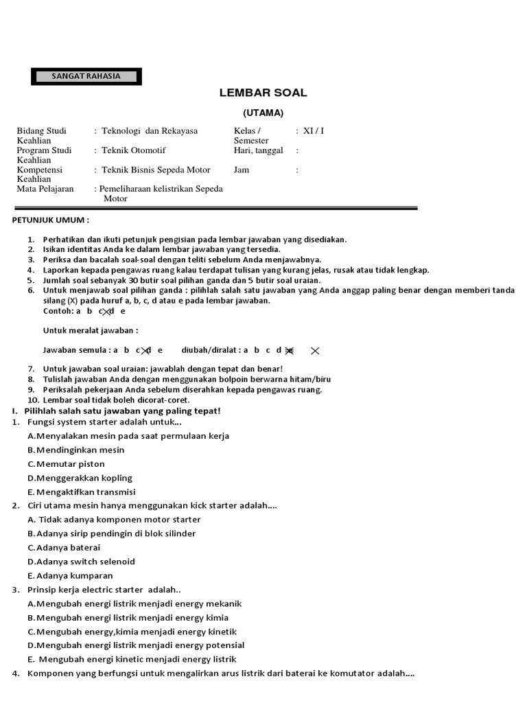 5Soal Essay Sistem Penerangan Sepeda Motor. 2Soal Pilihan Ganda Materi kejuruan TSM Teknik Sepeda Motor khususnya materi tentang engine materi sistem bahan bakar materi kelistrikan sepeda motor. 30Soal Pilihan Ganda Materi kejuruan TSM Teknik Sepeda Motor khususnya materi tentang engine materi sistem bahan bakar materi kelistrikan sepeda.