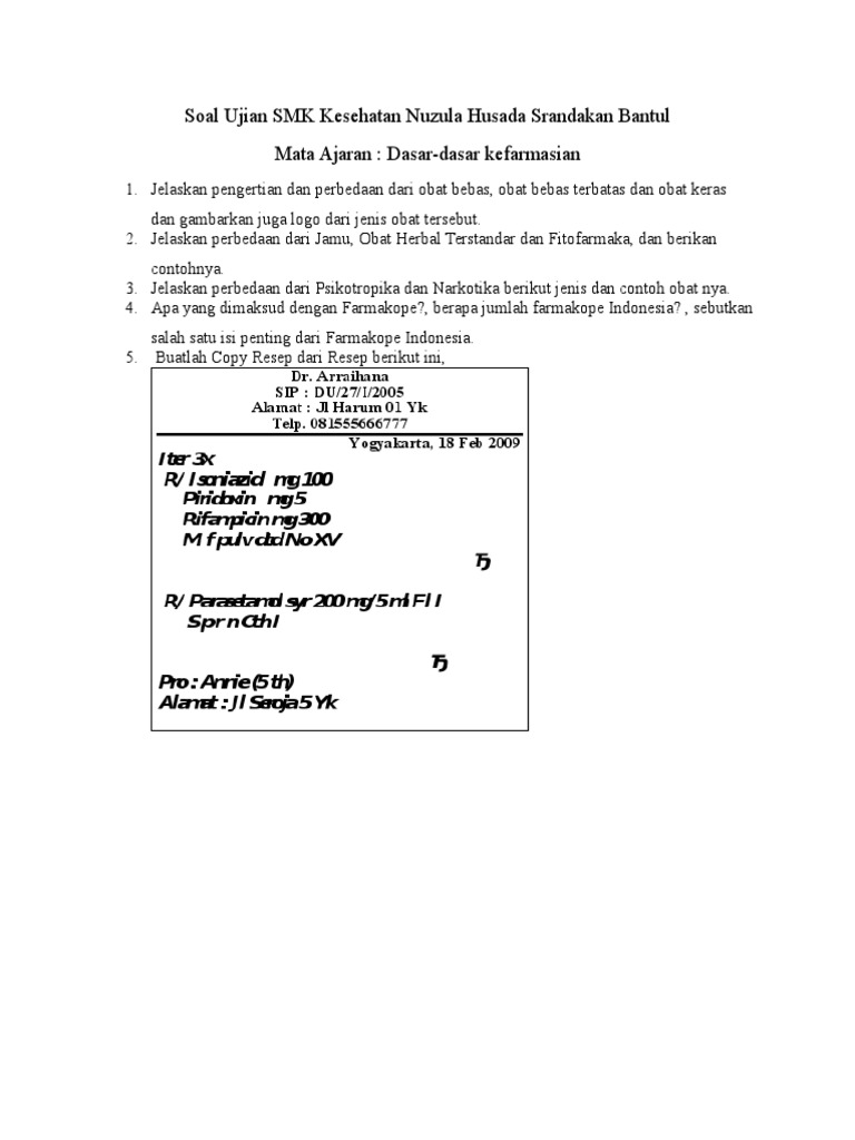 Download Contoh Soal Tes Masuk Smk Farmasi PDF 1800 MB - SamPDF Unduh Contoh Soal Tes Masuk Smk Farmasi PDF secara gratis di SamPDF. 150 Soal Teori Kejuruan SMK Farmasi Kelas XII Lengkap Dengan Kunci Jawaban Written By Admin. Salah satu yang mempengaruhi rendering adalah.