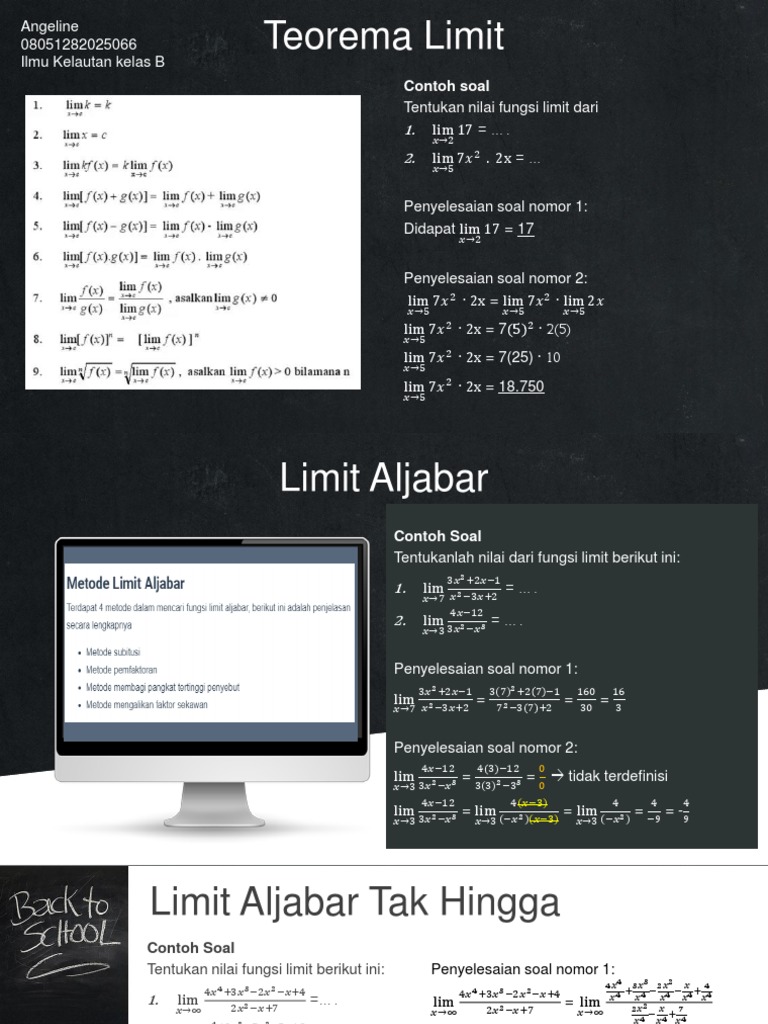 Bahwa nilai limit fungsi pada suatu titik dikatakan ada bila nilai limit sepihaknya sama atau nilai limit kanan 1 sama dengan nilai limit kiri 2. Bandingkan jawaban yang Anda peroleh. Misal lim lim.