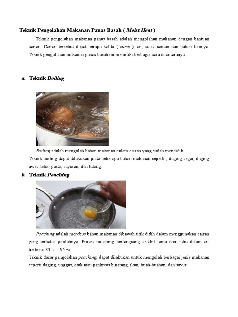 Grilling adalah teknik mengolah makanan diatas lempengan besi panas gridle atau diatas pan dadar teflon yang diletakkan diatas perapian. Dalam teknik ini perlu diberikan sedikit minyak baik pada makanan yang akan diolah mauoun pada alat. - Tekhnik pengolahan makanan panas basah moist heat adalahmengolah bahan makanan dengan menggunakan bahan dasar cairan untuk mematangkannya Memasak.
