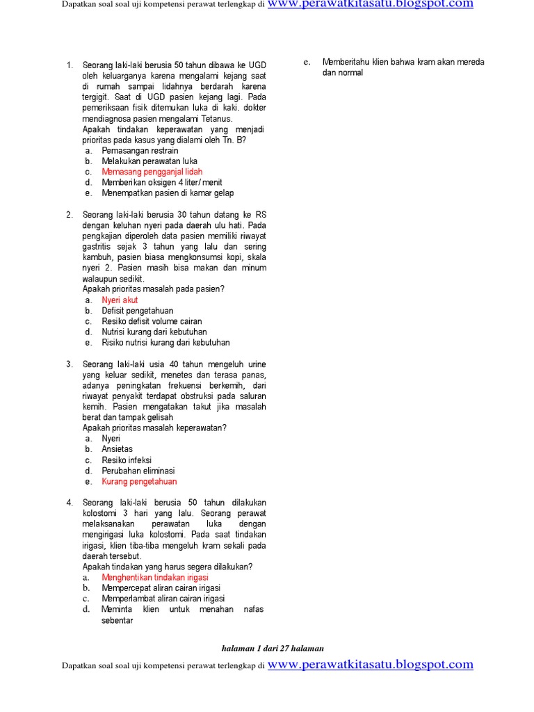 Dibawah ini Download Soal Uji Kompetensi Bidan dan Kunci Jawaban pdf 2017 2018 0219 2020 2021. Dibawah ini kami sajikan terdapat 4 buah soal Uji Kompetensi atau UKOM Perawat Tahun 2019 2020 pdf Disertai Jawaban dan Pembahasan. Seorang perawat sedang memberikan penjelasan kepada klien untuk persiapan pulang pada klien dengan kanker prostat setelah tindakan prostatectomy.