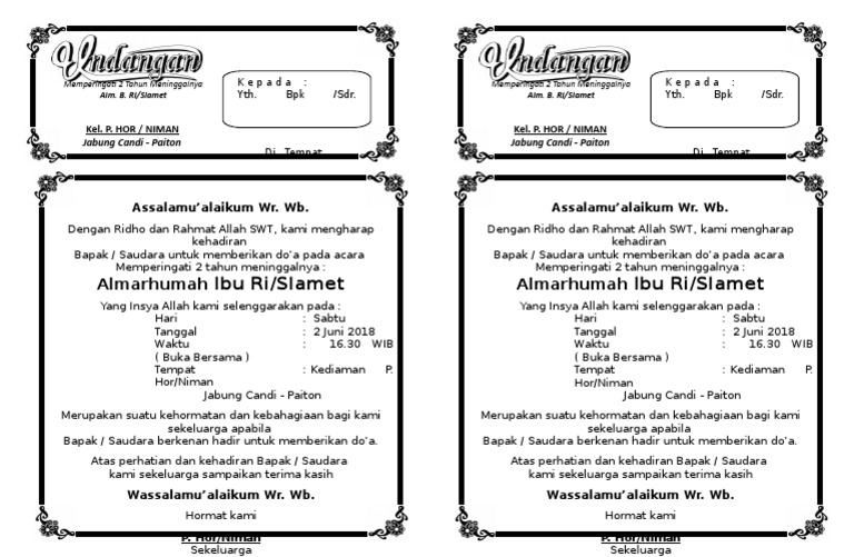 BapakSaudara Di tempat Di tempat. Download Undangan Tahlilan 3 7 40 100 1000 Harian - 1 Lembar Jadi 2 - Undangan Microsoft Word Bisa Diedittinggal ganti data yang diinginkan. KHAzhari 13 ulu lrg jaya kampung Bahsin Acara.